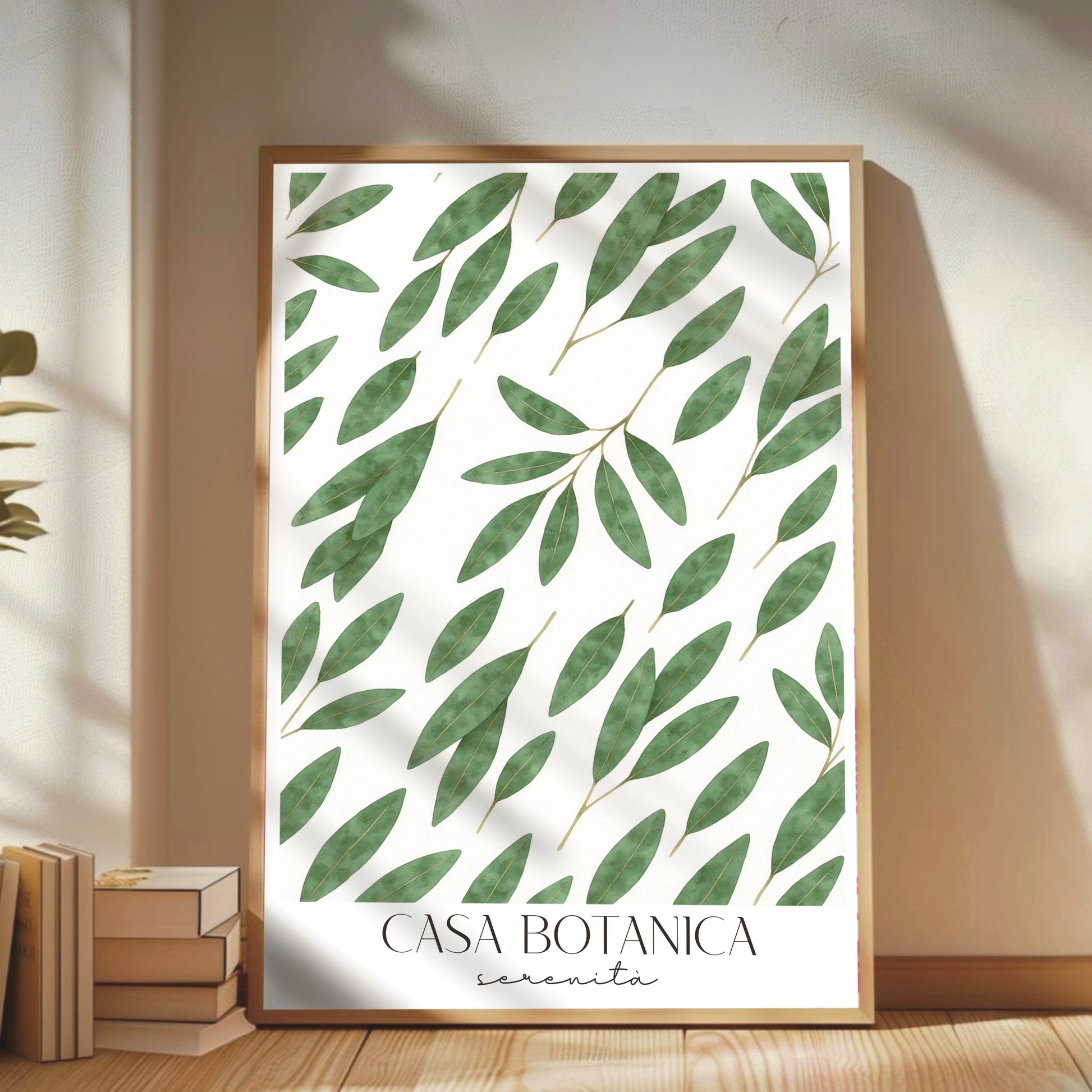 Bring a breath of calm into your home with Casa Botanica – Serenità, a tranquil botanical print featuring soft watercolor eucalyptus leaves scattered across a gentle white background. With its earthy tones and delicate natural form, this piece evokes a sense of stillness, simplicity, and organic beauty.