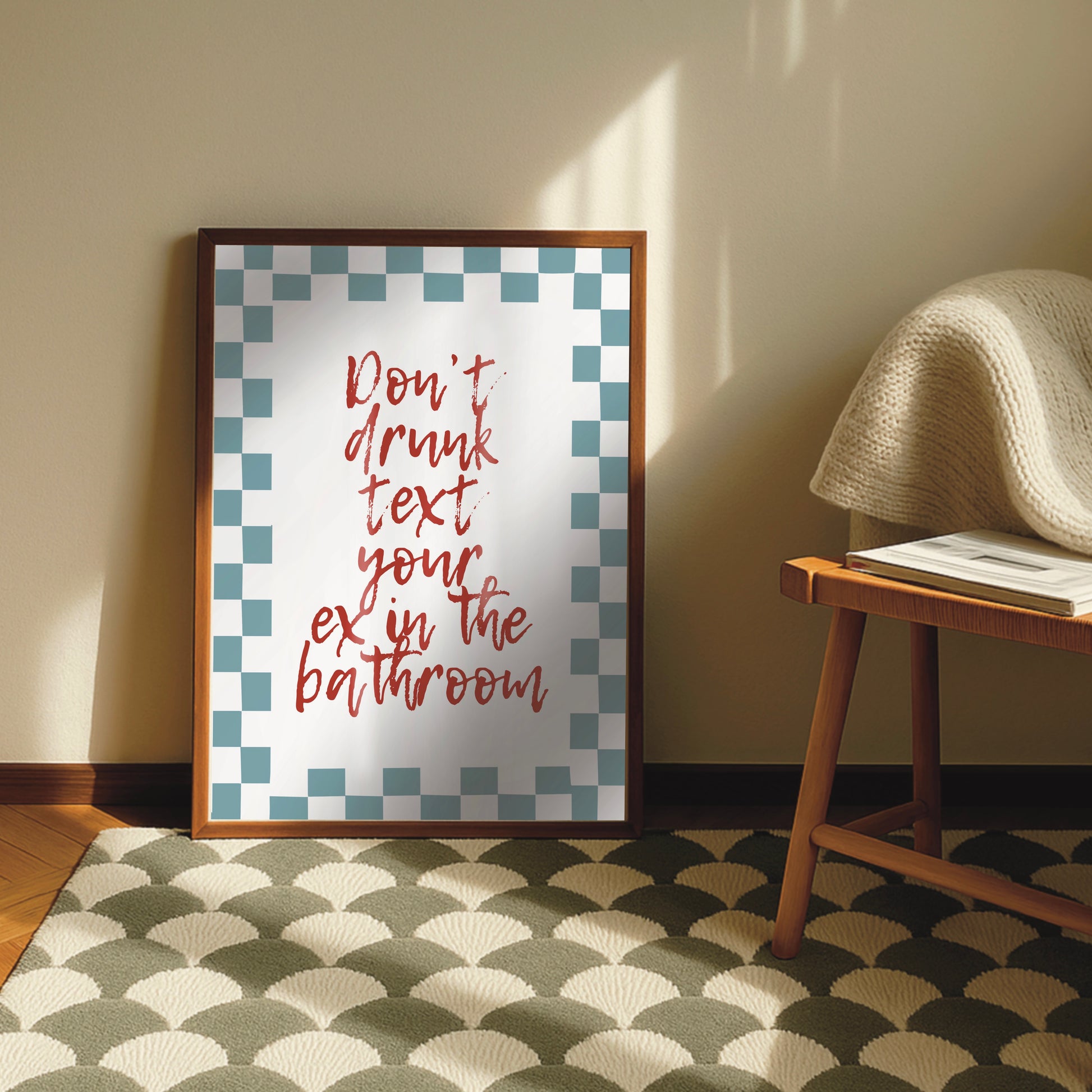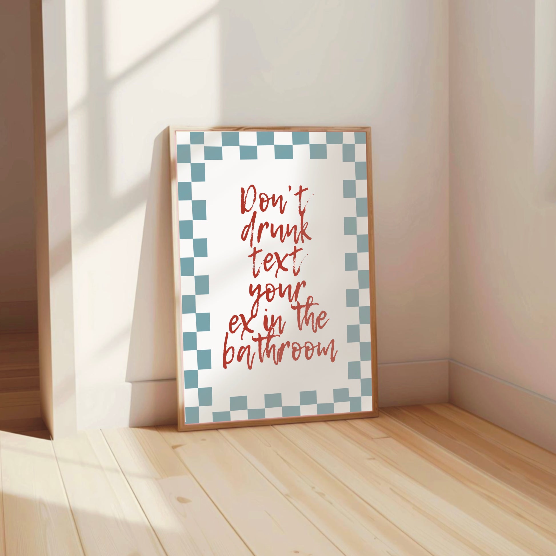 Stop emotional damage before it starts with our hilarious “Don’t Text Your Ex in the Bathroom” wall print – the perfect blend of sass, style, and life-saving advice. Designed in a bold retro checkered pattern, this funny art print brings a pop of color and humor to your bathroom, reminding you (and your guests) to make better life choices—one flush at a time.